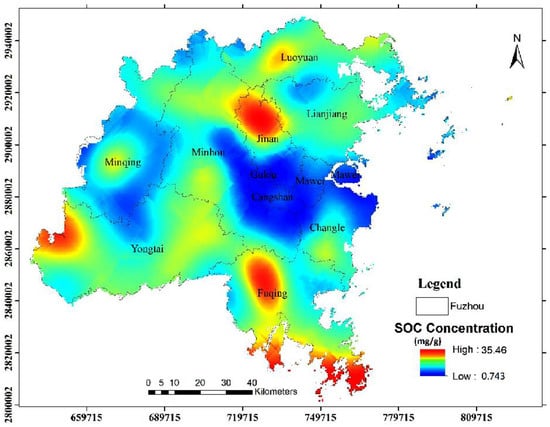 The results indicate that the RF had excellent performance for SOC prediction. The SOC variability map predicted by the RF model using selected important predictors is shown in Figure 10.