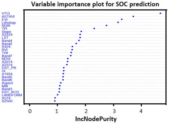 Based on the IncNodePurity index model, the 15 most important variables for prediction of SOC distribution in the study area were VTCI, ASTAVI, EVI, lithology, NDBI, TPI, slope, X2224, LST, Band4, X424., RVI, TWI, Band7, and NDVI (Figure 12).