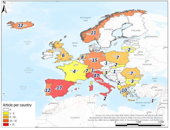 After Italy, the other nations most represented are as follows: (i) Spain, with 14 articles in peer-reviewed journals (e.g., [53,54,55,56,57]) and 3 congress proceedings [58,59,60] for a total a 17 scientific contributions; (ii) Germany, with a total number of 15 scientific publications equally divided into various scientific journals (e.g., [61,62,63,64]) and conference proceedings (e.g., [65,66]); (iii) Portugal, with 8 peer-reviewed scientific articles (e.g., [31,67,68]), 1 book chapter [69], and 3 conference paper (e.g., [70]), and Iceland, represented by 11 contributions in peer-reviewed journals (e.g., [71,72,73]) and only 1 conference abstract [74], for a total of 12 scientific contribution for both countries; (iv) Norway, with 8 contributions in scientific international journals (e.g., [22,75,76,77]), 2 book chapters of peer-reviewed journals [78,79], and only 1 proceedings abstract for a conference [80]; and (v) Greece, equally divided in 5 peer-reviewed journal articles (e.g., [81,82,83]) and 5 abstracts for congresses or meetings (e.g., [84,85,86]), for a total contribution of 10. It has to be considered that, for the Germany, 11 scientific contributions, i.e., 6 articles published in international peer-reviewed journals and 5 abstracts for congresses refer to the Upper Rhine Graben Area, were focused on the boundary between France and Germany. To avoid repeated counting, it was decided prior to processing to assign all the contributions about the Upper Rhine Graben Area to Germany.