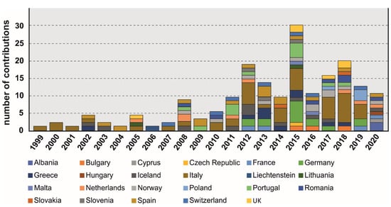 The correlation between the temporal evaluation of European and Italian studies is interesting. For the first few years, this relation is easily comprehensible considering that the scientific contribution collected for the first three years, i.e., 1999–2000 and 2001, involved the Italian territory. It is interesting to note, comparing Figure 2 and Figure 7, that the trend is very similar, with an incremental increase that progressed until the peak contribution in 2015, which was then followed by a reduction. The high number of scientific contributions recorded over the Italian territory severely influences the trend of the temporal distribution that occurred over Europe. In contrast, the studies published in 2020 do not follow this role; in fact, the last analyzed year exhibits a relevant number of scientific contributions of 2019 even if no publications were published involving Italy. A similar correlation can also be identified when considering the European and Italian temporal distributions and the associated field of application.
