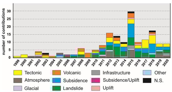 The joint application of SAR and GNSS data has been adopted in 9 different fields, classified as follows: (i) Tectonic; (ii) Atmosphere; (iii) Glacial; (iv) Volcanic; (v) Subsidence; (vi) Landslide; (vii) Infrastructure; (viii) Subsidence/Uplift; and ix) Uplift. In addition, another class has been added to include all nonconventional applications, as well as a Not Specified class (N.S.) for applications in which it was not possible to assign a specific field. A higher percentage of publications deal with subsidence phenomena (20.2%), followed by landslide events (19.7%) and tectonic analyses or seismic event back analyses (18.6%) (Figure 4).
