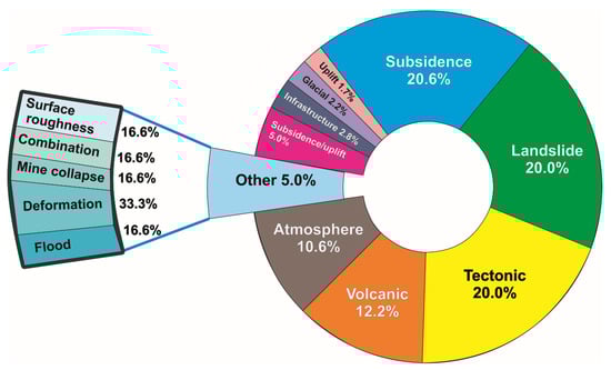 Volcanic (10.9%) applications are mainly concentrated in (i) Greece, focused on the investigation of Santorini volcano [158,159] and Nisyros volcano [83,86]; (ii) Italy, focused on the evaluation of the deformation of Mt. Etna, Sicily Region (Southern Italy) [160,161] and the Campi Flegrei, Campania Region (Southern Italy) [40,51]; (iii) Portugal, focused on the assessment of the geodynamics and displacement mechanisms affecting the Azores islands [13,14,69]; and (iv) Spain [55], focused on the volcanic deformation of the Canary archipelago [58] and Tenerife island [24,57,162,163], inevitably depending on the presence of active volcanoes. Iceland is represented by two scientific articles, one focusing on the lateral dyke grown [72] and the gradual caldera collapse regulated by lateral magma overflow [25] of the Bàrdarbunga stratovolcano in the South-eastern sector of the Iceland island; and a conference paper combining InSAR and GNSS data [74] that focuses on ground deformation measurements of the Northern Volcanic Zone of the island. In addition, Wadge et al. [17] published an article on Mt. Etna focused on the measurement of the tropospheric water value to better consider the contribution of the atmosphere to the differential radar interferograms of ERS1/2.