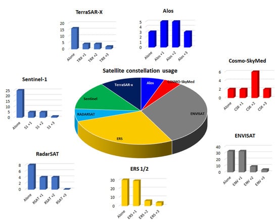 Combining the information regarding the year of publication of the scientific contributions collected and the investigated SAR satellite, it is possible to state that the later publications aimed to investigate the evolution of a phenomenon as long as possible. Obviously, this cannot be affirmed for publications involving atmospheric interactions and corrections or for those investigating the co-seismic earthquake effects of DInSAR.