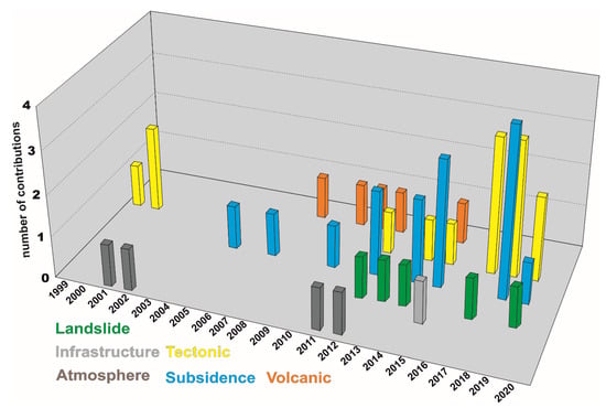 The analysis of the temporal evolution in relation to the field of application of scientific contributions (Figure 3) revealed that early studies were focused on the analysis of tectonic-induced deformations. The rise of an anticline beneath an urban area in Catania in 2001 [87] and the modeling of the dislocation of the edifices involved in the 1997 Umbria-Marche seismic sequence [88] were analyzed by integrating GNSS and InSAR data. In 2001, the first atmospheric investigation application was presented, showing primary results regarding the calibration of atmospheric effects on SAR interferograms by GPS and local atmosphere models [38]. In 2002, the joint application of GPS and DInSAR for volcano and seismic monitoring was carried out in different cases in Spain for the 1992–2002 period [55]. In 2005, the first application of the combined use of GNSS and SAR data for recognizing subsidence was published. In particular, five different measurement techniques, among which are the DGPS and MTInSAR approaches, were exploited for mapping and monitoring land subsidence in the Venice lagoon [43]. A year later, the first application to landslide studies was published dealing with the Triesenberg-Triesen landslide in Leichteinstein, where GPS monitoring data were compared with 3D models generated using an MTInSAR approach on ERS datasets [89]. Among the less represented fields of application, in 2002, the first application to glacial research was proposed, where an interferogram was generated to produce an ice surface motion map of the Gjàlp volcano in Vatnajokull, Iceland [29]. Regarding infrastructure and uplift case studies, the first key scientific contribution focused on the monitoring of the urban area of Bratislava, Slovakia [26] and on the investigation of an area close to the geothermal site of Landau, Germany [19,63].