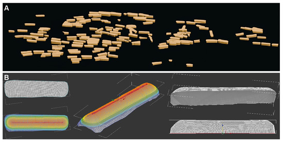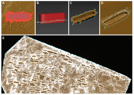 The 3D reconstruction of the mounds was the most time-consuming step of this work because its automation was too complex to implement due to the variety of forms of the tombs. For each of the 174 polygons illustrating the contours of the graves, we extruded them downwards to the minimum altitude of the corresponding head-basin-foot points (Figure 7A). We then retopologized these same contours by applying the Quadriflow algorithm [63] to mesh them strongly. We then selected a longitudinal slice of vertex with the soft selection tool [64] to bulge the shape. This slice selection had to be made visually to best match the shape of the graves. To obtain a closed volume, we used the “cap” tool [65] on the lower edge, flattened the resulting face with the “make planar” tool along Z and lowered this polygon to the minimum altitude of the border (Figure 7B). Finally, we rescaled this mesh resulting along Z, so that its volume corresponds to that calculated theoretically by the formula mentioned above.
