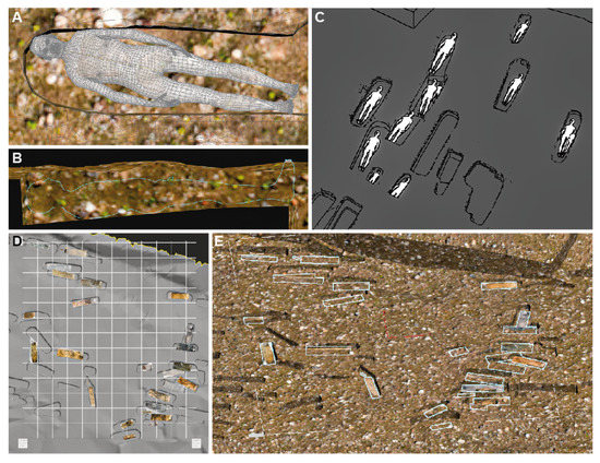 (A,B) A dummy’s head-to-head positioning process in burial 114 to position the bottom more precisely; (C) Stylized 3D view of the same process in progress on burials 104, 105, 110, 114, 115, 122, 123, 125, 126, 136, 170 and 174; (D,E) Integrating photos taken on-site with Virtualanthropy software.
