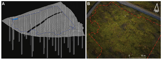 The first DTM presents the “bottom of form”, the second, the “surface” of the archaeological field before stripping and the last restores the ground level in the early Middle Ages (the “funeral mound” DTM). The first was created from the survey points in the field and using the QGIS 3.16.1-Hannover software (Figure 2A). A black and white raster illustrates the elevations from the TIN interpolation method (Figure 2B), and then the 3D model is created with the DTM to3D plugin [54] (Figure 2C).