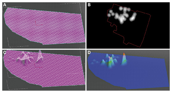 The process of creating a 3D heatmap in 3dsmax. (A) Fine retopologization of the plane intended to undergo the displace modifier; (B) black and white image used for the displace, with contour for recalibration on site; (C) application of the displace modifier; (D) application of a material with a gradient (diffuse map) and an opacity map using a planar UVW map modifier.