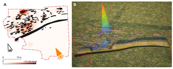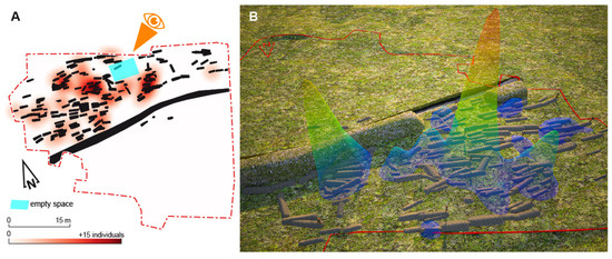 Concentration of all residual artefacts in the tombs. Heat map in plan (A) and 3D (B). The eye indicates the direction angle for the 3D restitution.