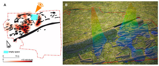 Heatmap representing the concentrations of individuals in secondary positions. Heat map in plan (A) and 3D (B). The eye indicates the direction angle for the 3D restitution.