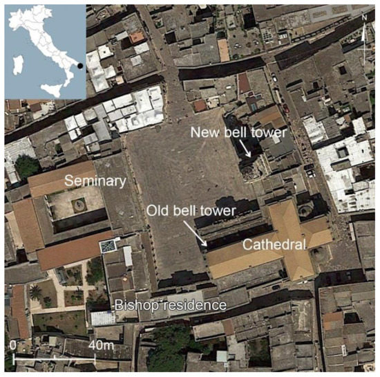 Lecce Cathedral is located in the center of the city (Figure 1), on the southeastern corner of a square where other edifices are built, including the bell tower, the bishop’s residence, and the seminary [1,2,3]. The cathedral, dedicated to the Assumption of the Virgin Mary, was first built in 1144 by bishop Formoso (dates of birth and death unknown). In 1230, it was rebuilt in the Romanesque style during the bishopric of Voltorico (born before 1214—died after 1252). After the demolition of the previous building in 1658, it was rebuilt once again in the Baroque style in 1659 by the architect Giuseppe Zimbalo (1620–1710) and by order of bishop Luigi Pappacoda (1639–1670). It was completed in 1670 and it has not gone undergone relevant changes to the present day.
