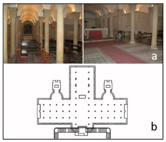 Photos (a) and plan (b) of the crypt under the transept of Lecce Cathedral.