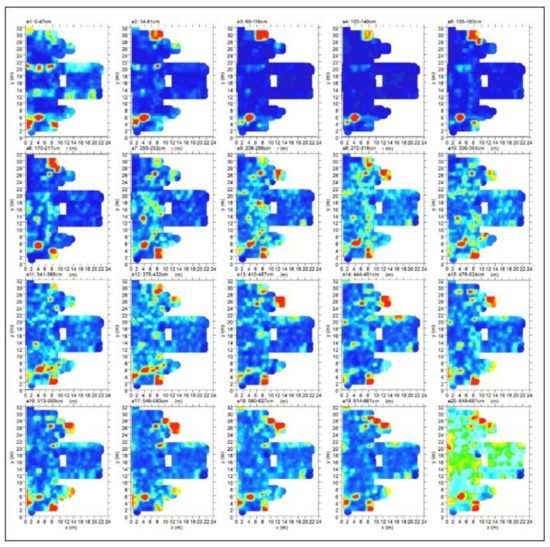 The way of acquiring the radar profiles (parallel profiles at a distance of 0.25 m) made it possible to create maps (horizontal time slices) within which it was possible to view the spatial distribution of the amplitudes of the reflected events.