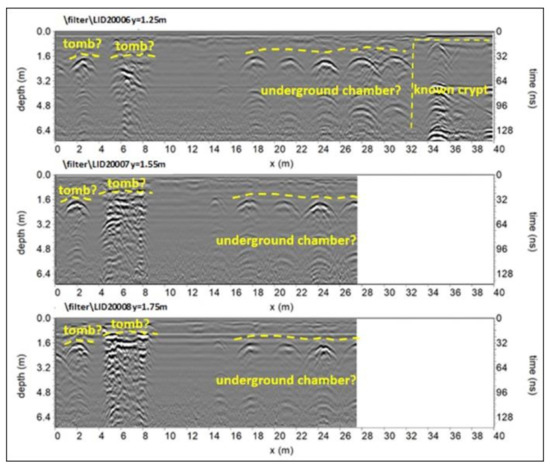 These wave reflections can be due to the material placed into tombs after burial. Additionally, there are extensive reflection events slightly undulating at a depth ranging from about 2.4 m to 4.0 m, which are probably due to the bedrock (yellow dashed line in Figure 4a,b).