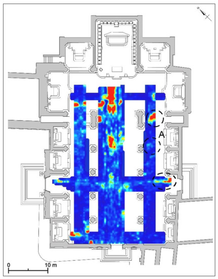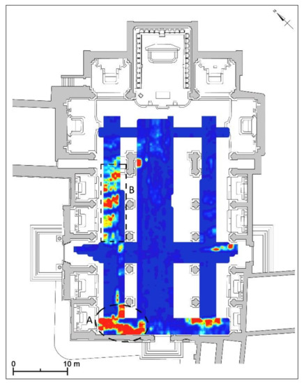 An interesting anomaly is visible at the central nave (indicated with “underground chamber?” in Figure 8), which is attributed to an underground chamber (Figure 8) that is located at a depth between 1.42 m and 1.92 m. This chamber, accessible from the crypt under the transept, was prospected by archaeologists after the geophysical surveys conducted in 2009: inside them, numerous human bones have been found, suggesting also the presence of a putridarium (Figure 9).