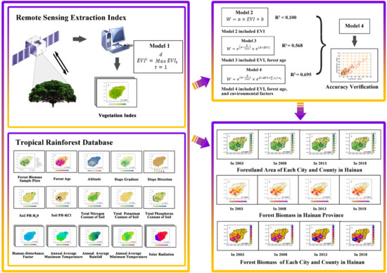 This study is based on data from the continual investigation of forest resources from 2003 to 2018 in Hainan (a total of 133 typical tropical rainforest permanent sample plots in four periods) and field survey data of tropical rainforest biomass, combined with meteorological data, terrain data, soil data, and population density data over the past 15 years. It is worth noting that in large spaces, forest age is the most important factor in forest biomass estimation [23]. Through correlation analysis, this study screened 14 main environmental factors to establish a tropical rainforest database (environmental information database, permanent sample plots biomass database, and forest age database) in Hainan. A tropical rainforest biomass estimation model using remote sensing with environmental information was established according to the change process of tropical rainforest biomass with forest age. We aimed to study the spatial distribution pattern of biomass in Hainan from 2003 to 2018 to overcome the saturation phenomenon and improve the accuracy of tropical rainforest biomass estimation with remote sensing (Figure 1). This study can help improve the level of scientific and technological decision-making and management of tropical rainforest resources by quantitative means and lay a foundation for the scientific operation and management of tropical rainforest ecosystems.