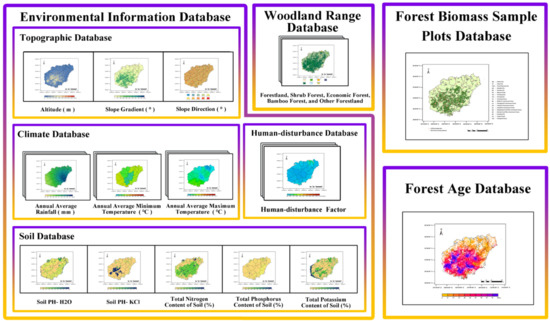 There were 14 pieces of environmental information involved in this study, all from the tropical rainforest database mentioned above (Figure 4). Among them, the annual average maximum temperature (°C), annual average minimum temperature (°C), and annual average rainfall (mm) were from the climate database. The information on soil , soil , total nitrogen content of the soil (%), total potassium content of the soil (%), and total phosphorus content of the soil (%) were all obtained from the soil database. The slope gradient (°), slope direction (°), and altitude (m) were obtained from the DEM terrain database. The human-disturbance factor (person/ha) was obtained from the human-disturbance database. Latitude (′ ′′) and longitude (′ ′′) were used for geographical registration between different data. In addition, tropical rainforest biomass was derived from the tropical rainforest biomass database. Forest age was taken from forest age database.