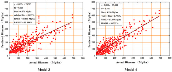 We used 133 verification sample data points to analyze the accuracy of Model 3 and Model 4. For verifying the accuracy of Model 4 estimation, the actual and remote sensing tropical rainforest biomass estimation values were compared and analyzed. We obtained Figure 5 through precision analysis. It can be seen from the figure that the estimated values are evenly distributed on both sides of the actual values. The of the verification accuracy of Model 3 was 0.631. The of the verification accuracy of Model 4 was 0.788, indicating good accuracy. Model 3’s Bias, relative Bias, root mean square error (RMSE), and relative root mean square error (RRMSE) were 6.376 Mg/ha, 3.619%, 88.565 Mg/ha, and 50.339%, respectively. Model 4’s Bias, relative Bias, RMSE, and RRMSE [35,36] were calculated as 4.920 Mg/ha, 2.796%, 67.459 Mg/ha, and 38.339%, respectively.