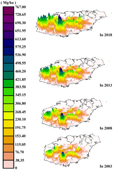 Spatial pattern and distribution of tropical rainforest biomass in Hainan Island from 2003 to 2018.