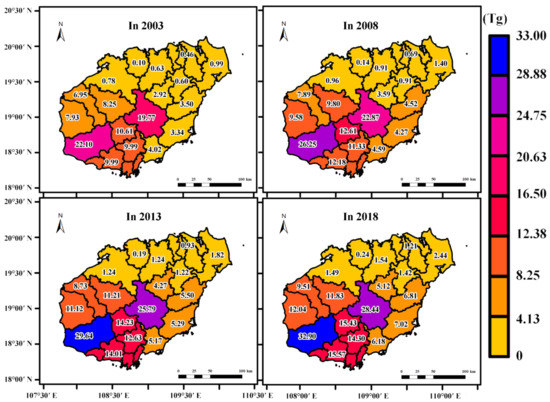 The kriging method was used to interpolate the tropical rainforest biomass and forestland area (Mg/ha) of each city and county in Hainan Island, and the total tropical rainforest biomass and forestland area of 18 cities and counties were calculated (shown in Figure 7 and Figure 8). The administrative division of Hainan Island from 2003 to 2018 is shown in Figure 2, and the biomass distribution of the tropical rainforest on Hainan Island is shown in Figure 7. The tropical rainforest biomass distribution in Hainan’s cities and counties was inconsistent. In this study, the biomass distribution of the tropical rainforest in Hainan Island was ranked. The tropical rainforest biomass above 10 Tg was divided into the first gradient, which included Ledong Li Autonomous County, Qiongzhong Li and Miao Autonomous County, Wuzhishan City, Sanya City, Baoting Li and Miao Autonomous County, Baisha Li Autonomous County, and Dongfang City. Cities and counties with tropical rain forest biomass above 5 Tg were divided into the second gradient, namely, Changjiang Li Autonomous County, Qionghai City, Wanning City, and Lingshui Li Autonomous County. Cities and counties with biomass below 5 Tg were divided into the third gradient, and they are Tunchang County, Wenchang City, Danzhou City, Chengmai County, Ding’an County, Haikou City, and Lingao County. The tropical rainforest biomass in all cities and counties increased annually, and Ledong Li Autonomous County had the fastest growth rate.