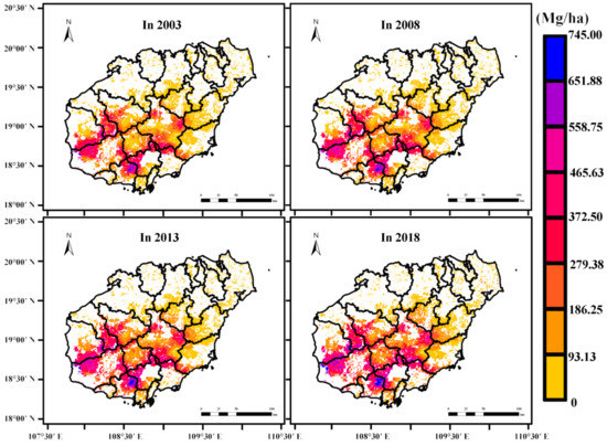 Based on the longitude and latitude of 5662 remote sensing estimation plots (Figure 3), EVI, forest age, and 14 main pieces of environmental information were extracted from the tropical rainforest database. The values of the 14 major environmental information variables collected from the databases of climate, topography, soil, and human-disturbance factors, and tropical rainforest biomass in 2003, 2008, 2013, and 2018, were estimated using the fitted tropical rainforest biomass estimation remote sensing model. A spatial pattern distribution of tropical rainforest biomass in Hainan was then generated using ordinary kriging spatial interpolation (Figure 6), with a spatial resolution of 2.0 km.