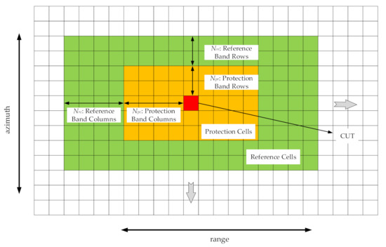 The GOCA-CFAR and SOCA-CFAR are improved methods of CA-CFAR. They are different from CA-CFAR in that they split the two-dimensional reference window around the CUT into left and right halves. Then, they calculate the sample mean for each half and select the greatest or smallest mean. The detailed description of GOCA-CFAR and SOCA-CFAR can be found in [16,17].