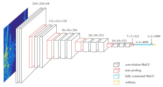 The VGG16 feature extraction network was proposed by the Oxford University Computer Vision Group in 2014. It builds a CNN with 16 layers by stacking a 3 × 3 convolution kernel and a 2 × 2 maximum pooling layer. The network consists of thirteen convolution layers, five pooling layers, and three fully connected layers. Among them, the total number of the convolution and fully connected layers with a weight coefficient is 16; hence, it is named VGG16. Figure 8 displays the VGG16 structure.