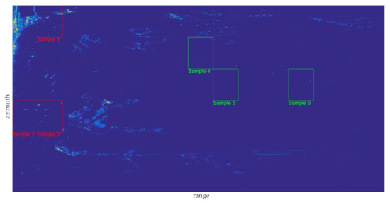 In the process of making the training set, two helpful information are applied effectively to confirm the presence of the moving targets in the observation scene. The first information is the AIS (Automatic Identification System) [28] information provided by the ships in the observation scene. Additionally, the second information is the comparison of the radar echoes of the same observation scene at different time (the time span can be several days), since its highly unlikely that a ship would remain in the same place for several days. After the confirmation of the moving targets in the observation scene, the annotation software, which is named LabelImg, are used to complete the labeling work on the segmented amplitude radar image. The aforementioned six image samples are annotated, as shown in Figure 15.