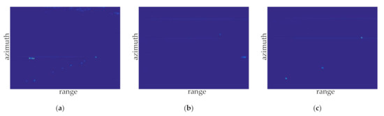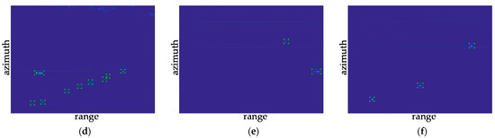 Sample 5 shows the strong interference component that exists in the image. Figure 17d–f show the CFAR detection results. The CA-CFAR and GOCA-CFAR detect one target correctly, and one target is missed. The SOCA-CFAR detects two targets correctly, and no target is missed. The number of false alarms is 97, 83, and 99, respectively. The recognition accuracy rates of three CFAR methods can be calculated as 1.02%, 1.19%, and 1.98%, respectively, and the recall rates are 50%, 50%, and 100%, respectively.