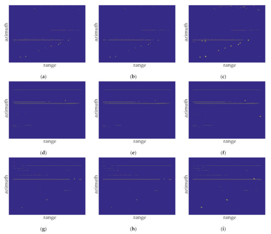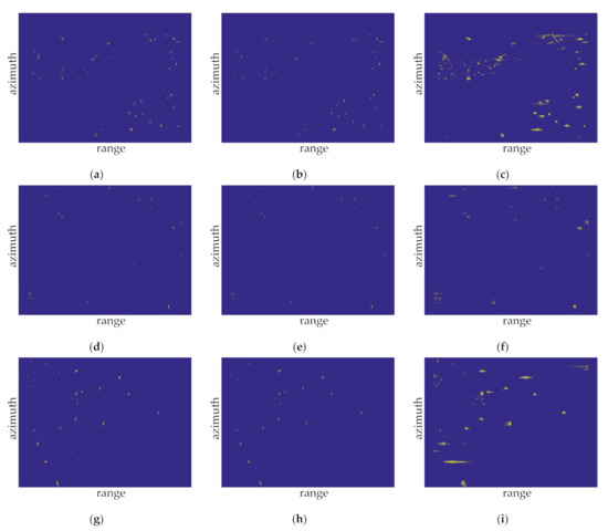 Sample 6 also shows the strong interference component in the image. The CFAR detection results are shown in Figure 17g–i. All the CFAR methods detect three targets correctly, and no target is missed. The number of false alarms is 114, 99, and 116, respectively. The recognition accuracy rates of three CFAR methods are 2.56%, 2.94%, and 2.52%, respectively, and the recall rates are all 100%.