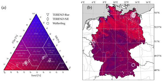 Soil composition for the test sites (a) and similarly color coded soil map for Germany (b), derived from Soilgrid’s data top layer sand and clay content [87].