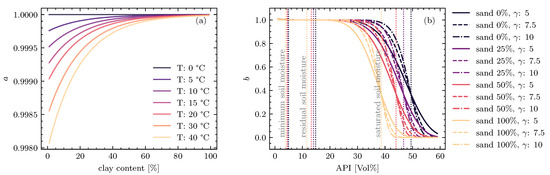 Soil moisture loss factors a, depending on clay content and temperature (a) and b depending on sand content and saturation state (b) for the applied and values.