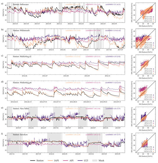 Overall, the API is similarly correlated to the in-situ measurements like the ESA CCI SM data is, with a mean correlation coefficient of 0.60. Here again, the API shows a higher standard deviation of 0.18 compared to 0.13 of ESA CCI SM data. Expectedly, the lAPI shows increased correlation to the soil moisture measurements with a mean of 0.72 and maximum of 0.88. This higher accordance is shown clearly in Figure 3 where the lAPI distinctly follows the summerly depletion for TERENO-Rur and TERENO-NE time series. The scatterplots demonstrate the improvements accordingly. For Wallerfing sites where there is no seasonality or summerly depletion to follow, the lAPI shows higher and prolonged outflow. This results in a difference in of −1.15 Vol% and −6.69 Vol% and also lowered that is reduced by 0.16 Vol% and 0.07 Vol% for the stations Wallerfing A2 and Wallerfing P6 respectively. The temporal accuracy and dynamic of the API and lAPI do match the measurement data very well which also the Wallerfing plots (Figure 3b,c) demonstrate clearly. This is the direct effect of the high resolution of the RADOLAN product that directly propagates into a rise in soil moisture.