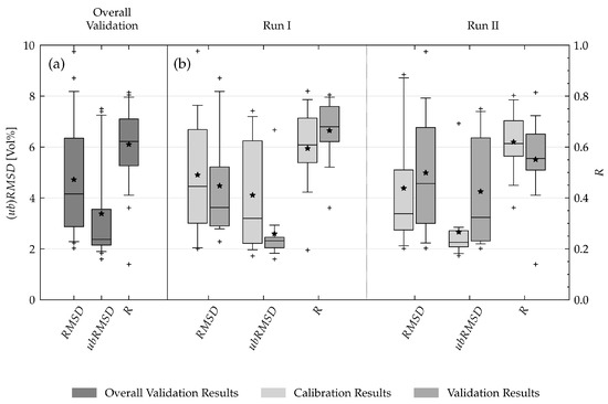 In run I the drops whereas in run II the with 4.99 Vol% is higher than in the overall calibration. The correlation coefficient behaves similar: the R of both validation sets combined does not change compared to the overall calibration, however run I validation set outperforms the run II validation set. This difference becomes more prominent for the . Both validation sets combined, the error metric does not significantly change compared to the overall calibration with 4.72 Vol% and 4.65 Vol%. But validation in the cross-validation run I outperforms run II validation with 2.59 Vol% compared to 4.25 Vol% . Standard deviation values increase in run II validation accordingly. Figure 4 clearly presents this fact. Whereas and R do not deviate much from the average distribution, the values for run I and II distinctly differ with a wide spread (standard deviation of 2.13 Vol%) of the metric for the validation set in run II and a compact distribution of for run I (standard deviation 1.28 Vol%). The disparity is to be attributed to the random partition of stations in the two sets: every group got a majority of a distinctive set of soil types (Table 1). Run I with stations of group II as validation stations holds many of the better performing stations, when calibrated separately, mostly of the TERENO-NE site.