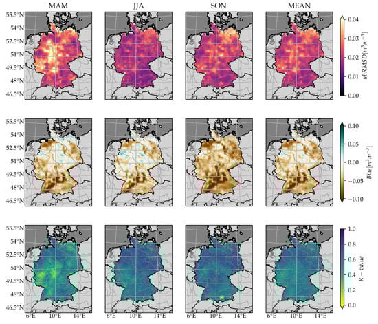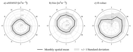 Investigation on different temporal resolutions by showing monthly and seasonal aggregates of error and correlation metrics is necessary to get unambiguous results [72]. This approach allowed the authors to identify a local non-stationary bias in the western part of Germany conducting the spatial comparison of the API and ESA CCI SM data.