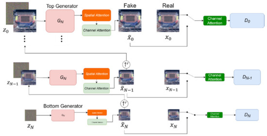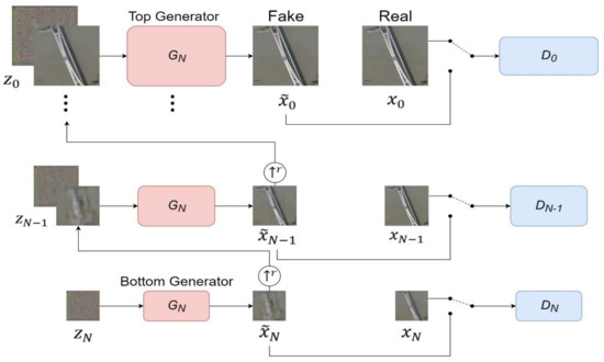 The generation of fake image samples starts from the coarsest scale and ends at the finest scale. The final pseudosamples are generated after passing through these scales in order. In Figure 5, only Gaussian white noise is inputted at the coarsest scale . Then, a pseudosample is outputted. The specific process is as follows: