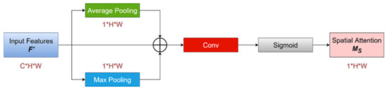 In computer vision, the main idea of the attention mechanism is that a system learns to focus on the places it is interested in. On the one hand, the neural network with the attention mechanism learns how to autonomously use the attention mechanism. On the other hand, the attention mechanism helps us to understand the world that the neural network sees. In 2018, Sanghyun Woo [35] proposed the Convolutional Block Attention Module (CBAM), a simple yet effective attention module for feed-forward CNNs. This module provides the attention network for channels and spatial dimension order, respectively shown in Figure 3 and Figure 4, which is used to weight input features. CBAM is a lightweight and versatile module that can be integrated into any CNN architecture. CBAM performs well when applied to image classification and object detection. The CBAM module architecture shown in the figure is divided into channels and spatial attention submodules. Each submodule learns “what” and “where” to focus on. Therefore, this module effectively helps the flow of information through the network by learning what is strengthened or what is suppressed. This module is simple, effective, and mainly used in feed-forward CNNs.