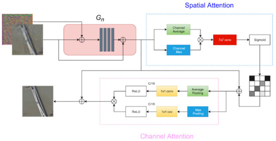 The Generator’s structure is shown in Figure 6. The input noise and pseudosamples are sent into five full convolutional network layers, each of which is composed of a convolution of 3 × 3 plus Batch Normalization and LeakyReLU. The output result of the convolutional network is passed through the spatial and channel attention modules. The information extracted by the convolutional network is given a weight order instead of only texture reconstruction. The operation of is as follows: