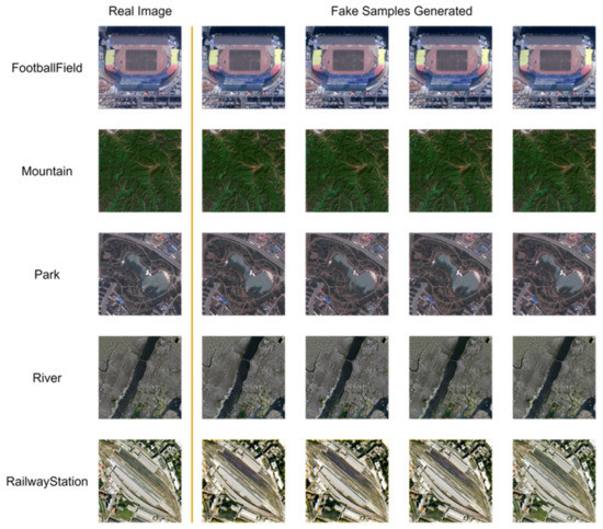 The fake samples separately generated by the original and improved SinGAN are shown in Figure 9 and Figure 10. This study uses the remote sensing scene images from the FootballField, Mountain, Park, River, and RailwayStation classes in the UC Merced Land-Use Dataset as training sample for the model with the same training parameter settings (Num Layer = 6, Max Size = 250, Epochs = 2000, learning rate = 0.0005). The original SinGAN and the improved SinGAN are good at restoring the texture details in each place and can find the specific origin from the training samples. However, the pseudosamples generated by the original SinGAN with the main body of the remote sensing scene image restored are not very good. For example, in the FootballField class sample, the grass in the center of the playground cannot be represented as a complete rectangle, and a piece is missing. In the Park sample, the original gourd shaped pond has been seriously distorted to the extent that it is unrecognizable. The relatively regular paths in the park have been deformed to the extent of being a maze. In the RailwayStation sample, the positions of the stations and tracks have been exchanged or are missing, while the shapes of houses on the surface have been scaled, rotated, or blurred. These objects cannot be counted as real surface samples. With regard to the natural features, the main problem is that the location of the objects is wrong. Although the basic shapes of the major features can be effectively learned, problems such as location discontinuities, location errors, and orientation errors occur during the reconstruction of the samples. For example, in the sample of Mountain, the positions of the peaks have been changed, and multiple peaks have been generated at the same location. However, such a fake sample is still learnable considering the sample diversity. In the sample of River, rivers that should be a whole have been broken into multiple sections and distributed in different locations of the image, which is a geographical correlation error. However, the five types of features do not produce dissimilarity around the image, especially in the four corners, but restore the distribution of the sample intact. In Figure 10, the abovementioned problems are well solved by the improved SinGAN.