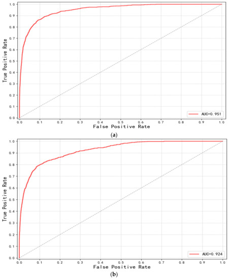 In the UC Merced Land-Use Dataset, the pseudosample training dataset generated by the improved SinGAN on VGG16 and VGG19 increases the overall accuracy of the network by 5% and 10% to 20% compared with the other two training sets. With the advancement of the kappa coefficient, a 5% increase was observed on VGG16 and VGG19. The overall accuracy improvement is 9% on the DenseNet121 network and 13% on the MobileNet network. The kappa coefficient boost is 10% on the DenseNet121 network and 14% on the MobileNet network. The receiver operating characteristic curves (ROC) and area under the curve (AUC) for each dataset based on VGG16 are shown in Figure 12. The AUC values are 95.1%, 92.4%, and 79.0% for each dataset. Moreover, quantitative comparisons in terms of the confusion matrix are also provided in Figure 13.