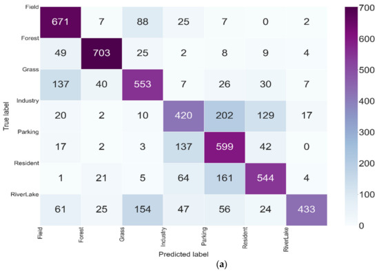 Confusion matrix is mainly used to compare the differences between the classification results and the real objects of the ground surface. The accuracy of the classification results is displayed inside a confusion matrix. The confusion matrix is calculated by comparing the true classification of each surface scene with categories predicted by the classification network. Each row of the matrix represents the instances in a predicted class, while every column indicates the instances in an actual class.