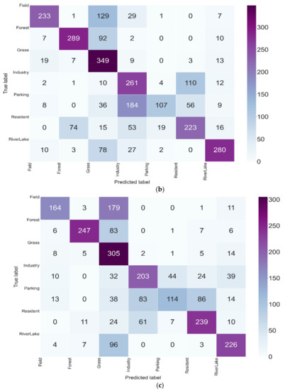 Comparisons of confusion matrices on the three different datasets in UC Merced Land-Use Dataset. (a) Datasets with fake samples generated by the improved SinGAN, (b) Datasets with true samples used for the training of the improved SinGAN, (c) Datasets with random samples selected randomly by the classifier network.