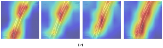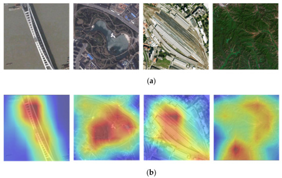 Attention maps derived from the VGG16 network by different methods. (a) Original remote sensing images. (b) Visualization results of the original images. (c) Visualization results of the fake samples by rotation. (d) Visualization results of the fake samples by flip. (e) Visualization results of the fake samples by the improved SinGAN.