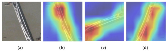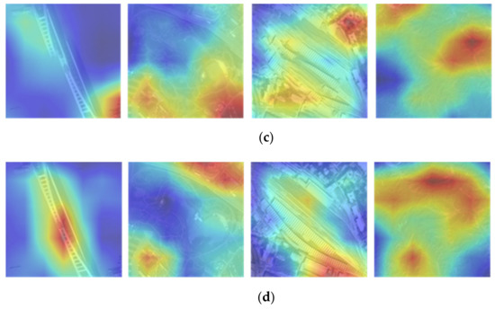 Original remote sensing images and the attention maps derived from the VGG16 network. (a) Original remote sensing images. (b) Visualization results of the original images. (c) Visualization results of the fake samples by the original SinGAN. (d) Visualization results of the fake samples by the improved SinGAN.