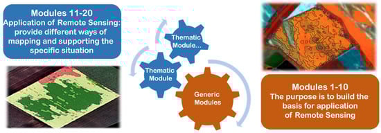 Twenty modules (courses) on remote sensing were developed (for details, see Section 3.2). The modules cover the principles as well as specific thematic applications in the field of remote sensing. The LMS contains a comprehensive set of content with teaching guides for teachers (e.g., instructors, lecturers, professors) and learning guides for students, which can be used for online and for face-to-face teaching. Students can independently perform the exercises, as case studies are available on the LMS along with detailed description of the workflow and necessary datasets.