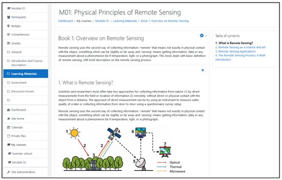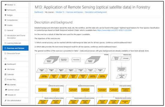 Supplementary materials, exercises, and case studies in the IRSEL modules were mainly implemented with the Moodle resource ‘Page’ and ‘File’. ‘Page’ provides the e-learning content or activity in a text format, but also images, audio, and/or video material, or any other code can be embedded. An example is given in Figure 3. Other resources can be linked, e.g., external web pages, movies, quizzes, etc. []. The ‘File’ resource enables uploading and accessing all types of files. To open and handle proprietary file formats (e.g., specific GIS or remote sensing file formats), the students need access to the specific software []. In IRSEL, both activities were prioritized to deliver the thematic modules (Table 2).