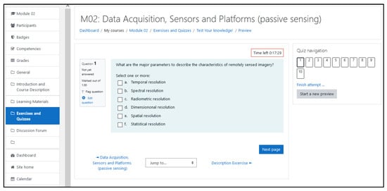 The ‘Quiz’ tool was implemented for self-assessment, usually at the final stage of a module. ‘Quiz’ enables a bundle of question types, e.g., multiple-choice, true-false, matching, short-answer, numerical, drag and drop images, and text []. Figure 4 shows one question of a quiz.