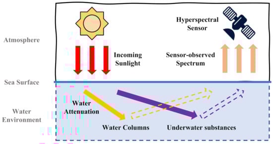 Generally speaking, the bathymetric model, depicting the generation process of sensor-observed spectrum in an underwater HSI, can be interpreted as a specific mathematical formula. Although intuitively, the aforementioned generation process can be illustrated in Figure 1. The sunlight firstly enters into the body of water and then is reflected by the water columns or targets of interest. During this transmission process, a considerable amount of attenuation will be imposed on the sunlight owing to the interference of the surrounding water. Therefore, the hyperspectral sensor would gather the reflectance spectra derived from water columns and the desired targets with the influence of water attenuation. More specifically, sensor-observed underwater spectrum represents a linear combination of two different kinds of reflectance spectra while the weight coefficients are determined by water attenuation []. Then, the general bathymetric model can be formulated as: