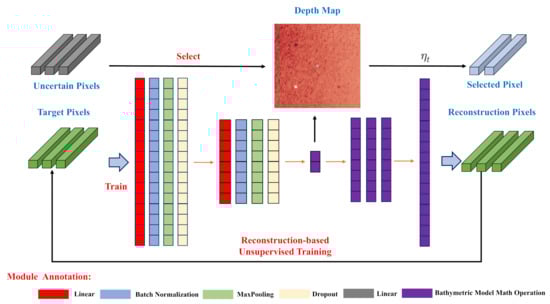 As mentioned beforehand, the water-associated parameters have been computed by the IOPE-Net. That is, the bathymetric mentioned in Equation (1) will become a simple function with the only variable depth information H. Besides, the sensor-observed spectra are HSI and are also known as prior knowledge. Therefore, estimating the target depth information can be transformed into finding out the solution of a linear equation with a single variable. However, it is difficult to use typical mathematical convex optimization (MCO) methods to solve this linear equation. On the one hand, due to the redundant spectral information of input HSI, the rank of the coefficient matrix is smaller than the rank of augmented matrix for the above linear equation. Under this condition, MCO is not capable of finding out a real number solution. On the other hand, the impact of spectral variability derived from environment factors will make it difficult for MCO methods to acquire a stable result. Moreover, previous works [,] have confirmed that MCO is time-consuming, especially in dealing with large-scale datasets.