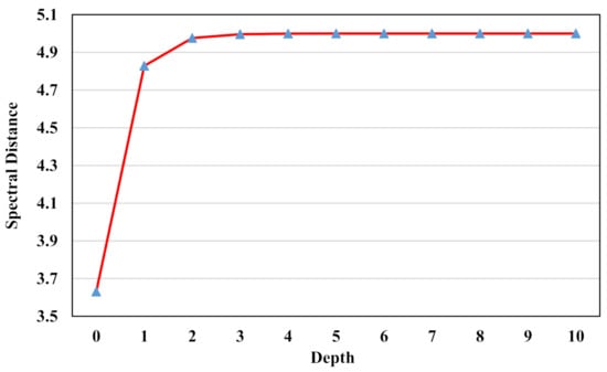 (3) Depth Value Constraint Loss: According to Figure 4, as the depth value increases, the spectral distance between sensor-observed spectrum and land-based spectrum is becoming larger. However, the degree of this change in spectral distance gradually decreases and finally turns into zero. In other words, when depth information exceeds a certain value, altering the depth value would not have the impact on . This phenomenon would lead to the gradient vanishing problem if the depth estimation network has not been well initialized and then predicts the depth information as a large value. The precondition of figuring out the depth information is that the target-associated spectrum should be distinguishable from the background spectrum. However, as the value of depth information increases, the target-associated pixel will finally turn into the background pixels. Therefore, the depth value constraint loss, which restricts depth information H to a relatively small value, is required for contributing to the convergence of the depth estimation network.